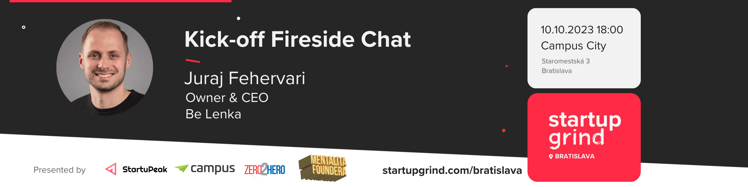 Po 4 rokoch prinášame Startup Grind opäť na Slovensko. 🥳 Prvý zo série Fireside Chatov odštartujeme s Jurajom Fehervarim, CEO a majiteľom značky barefootovej obuvi Be Lenka. 🤩