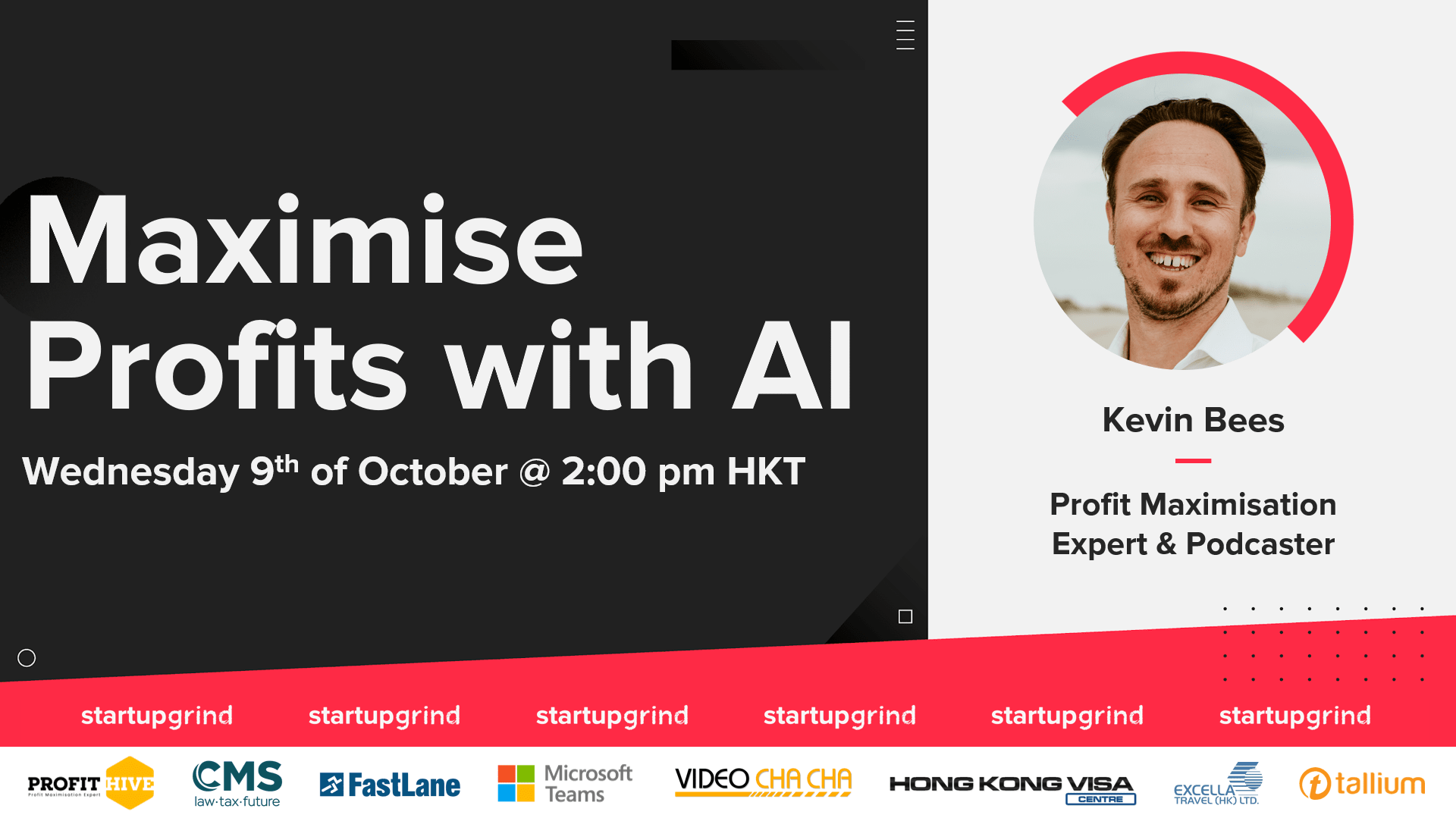 Join us at Startup Grind Hong Kong as we welcome Kevin Bees, a Profit Maximisation Expert from ProfitHive and renowned Podcaster, to guide you through the process.