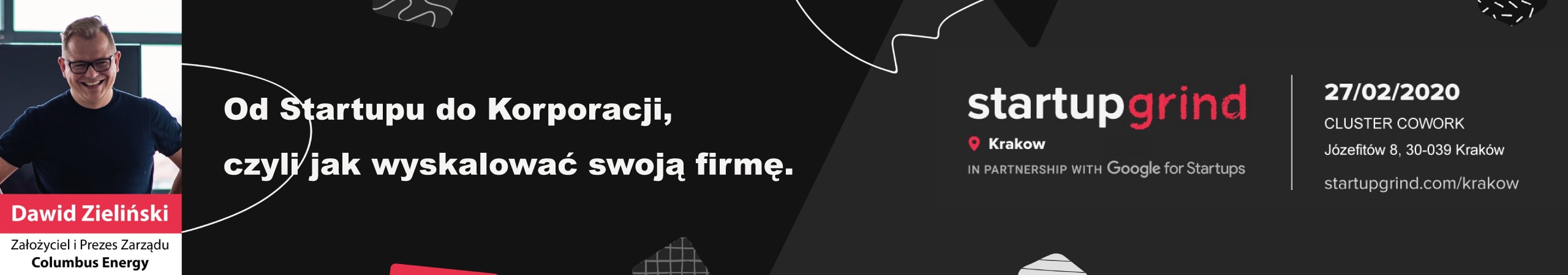 Zapraszam serdecznie do lutowej edycji spotkania Startup Grind Kraków, którego gościem będzie Dawid Zieliński - założyciel i prezes Zarządu Columbus Energy, lidera rynku mikroinstalacji fotowoltaicznych w Polsce. Od 6 lat z sukcesem rozwija firmę, której zaufało już ponad 10 000 rodzin, a sama spółka wyceniana jest przez inwestorów giełdowych na prawie 1 mld zł.