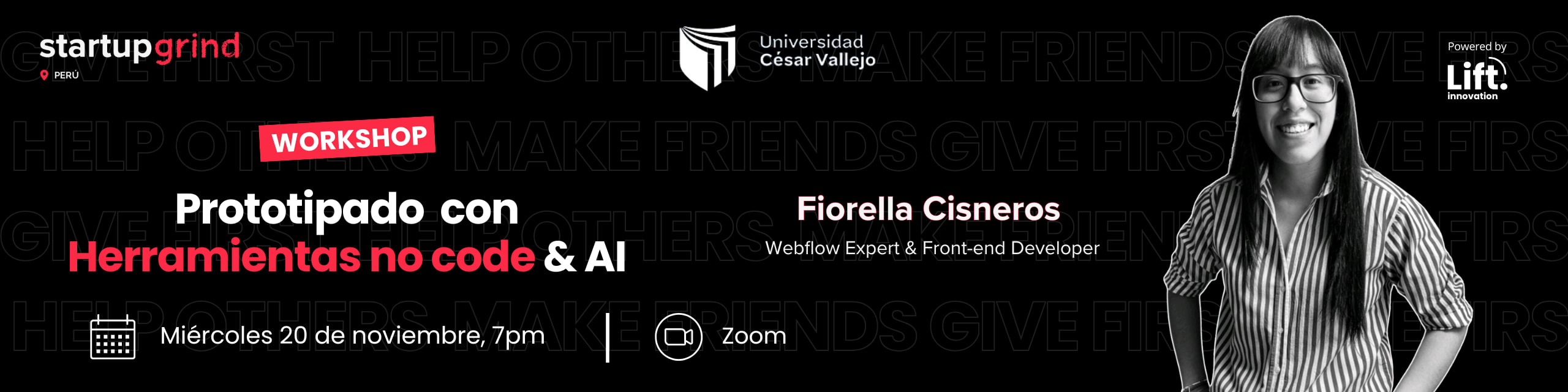 En este workshop, Fiorella te enseñará a prototipar creando interfaces rápidas, intuitivas y sin necesidad de escribir código. ✨💻