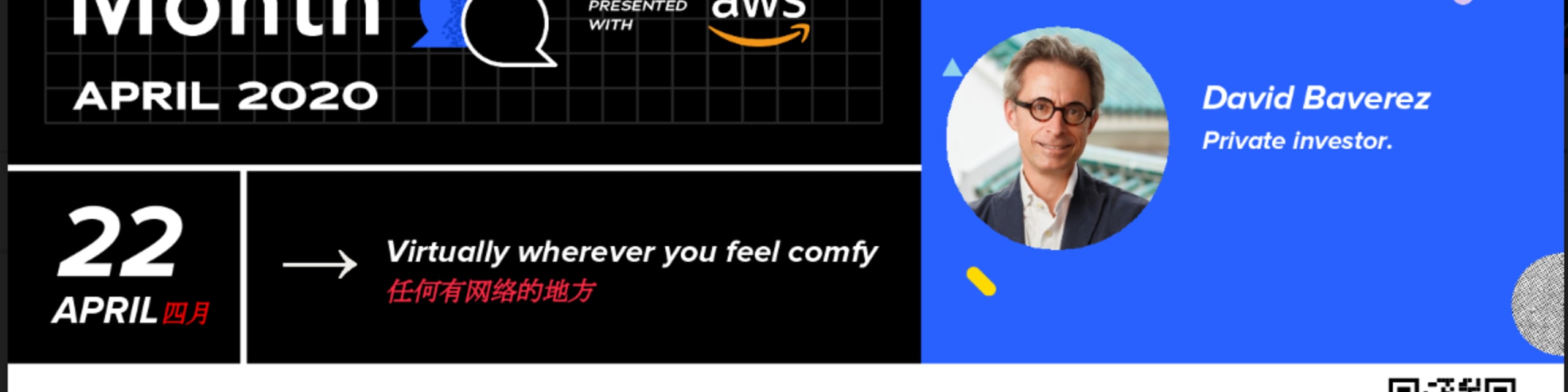 David Baverez, un investisseur aguerri en Europe et en Asie, nous rejoindra le 22 Avril à 13:00 (Heure de Paris) pour expliquer pourquoi la Chine et la Europe on besoin l’un de l’autre et partager ses idées sur l’arbitrage entre la l’Ouest et l’Est, l'épidémie de CoVid-19, et comment approcher les business angels. Encore un evenement remarquable de la collaboration entre Startup Grind Chengdu et Paris.