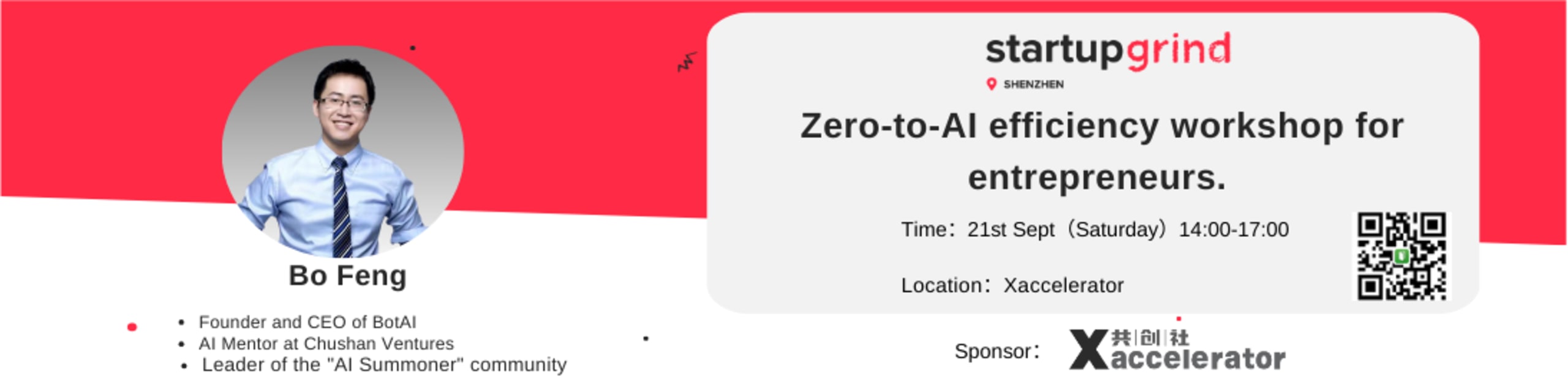 On the afternoon of September 21st, Startup Grind Shenzhen will host a zero-to-AI efficiency workshop for entrepreneurs. We’ve invited guest speaker Bo Feng founder and CEO of BotAI, AI mentor at Chushan Ventures, and the leader of the "AI Summoner" community. He will share real-world cases and unveil AI efficiency tools in entrepreneurship for individuals and SMEs. Attendees will also participate in interactive, hands-on practice during the workshop.